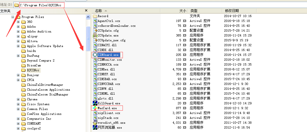 C:Program FilesBJCINcc目录下的CINGuard.exe和MacCard.exe;
